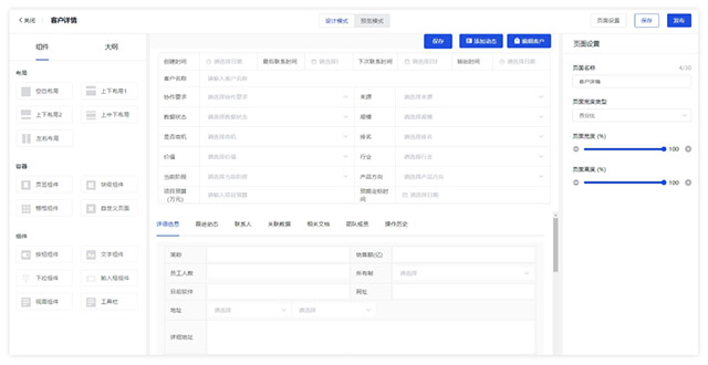● 可視化拖拽頁面布局組件快速應(yīng)用頁面建模,多種布局模式個性選擇自由搭配。